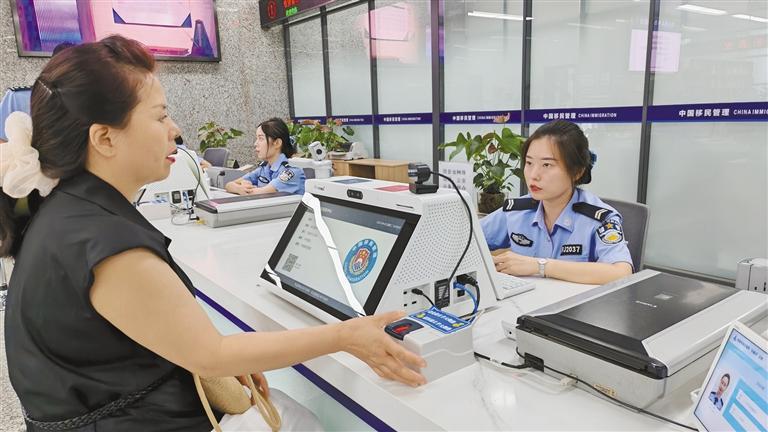 8月5日,在西安市政务服务中心公安专厅,工作人员为群众办理出入境业务。