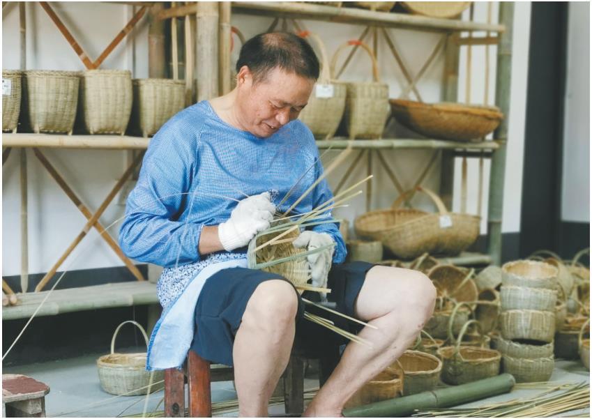 八月一日,“篾艺竹坊”的业主许本银在编竹篓。 本报记者 吕扬摄