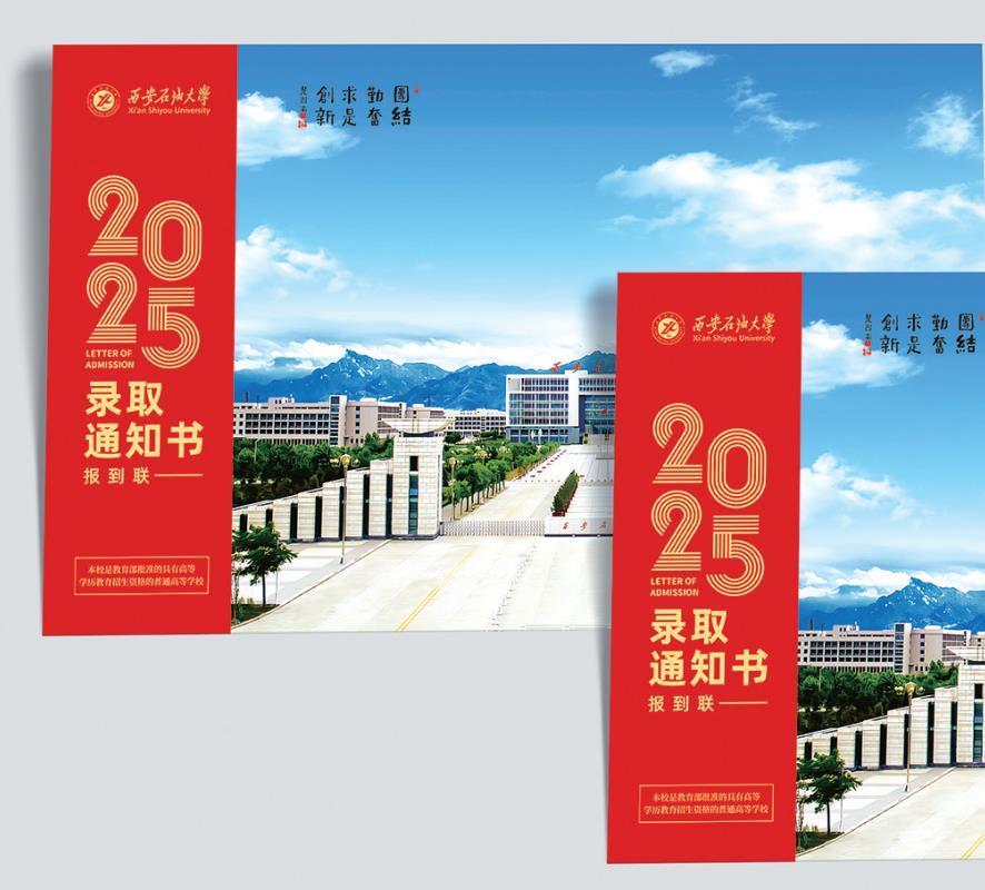 西安石油大学的录取通知书一式两联。报到联是入学的凭证,留存联则能永久珍藏。留存联边框选用喜鹊纹样,既寓意录取的喜讯,又寄托学校对学子学业进步、前程似锦的美好祝愿。线描底纹融入校图书馆与井架元素,巧妙展现出学校浓厚的学术氛围与鲜明的石油行业特色。“铁人王进喜”防伪图案,更是学校以石油精神办学、铁人精神育人、延安精神铸魂理念的生动体现,彰显出独特的行业特色与育人宗旨。
