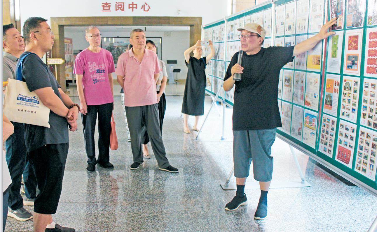 展览精选353枚抗战题材邮票和明信片、纪念封等邮品,500余枚火花以及60余枚抗战类纪念馆、纪念地门券等藏品。图为协办此次展览的民间收藏家在讲解展品。