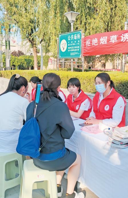 5月31日,延安市妇幼保健院“白求恩医疗服务队”成员在延安文化艺术中心广场进行禁烟宣传(资料照片)。 受访单位供图