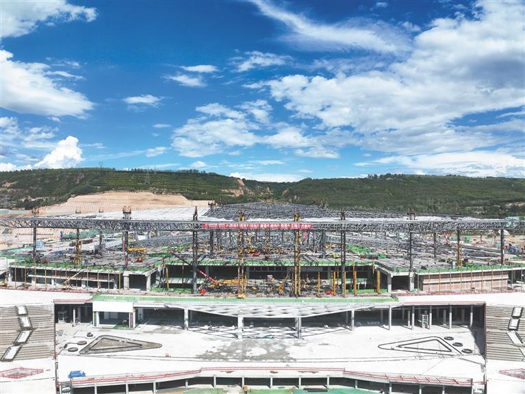 8月15日,在27台液压油缸的共同作用下,西安东站屋盖钢结构桁架提升工程启动,站房建设进度不断加快。图为西安东站项目施工现场。