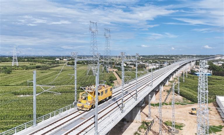 8月18日,西延高铁接触网冷滑试验正式启动。图为西延高铁四电1标接触网作业车辆进行冷滑试验。