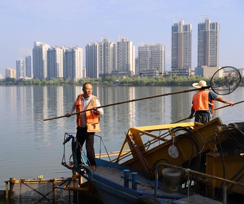 7月22日,保洁员在汉江河道打捞水面漂浮的杂物(资料照片)。 本报通讯员 梁逸晨摄