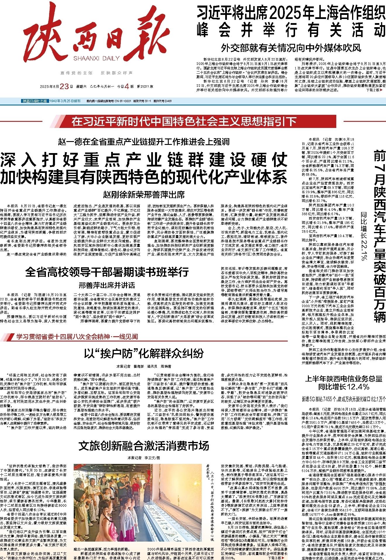 赵刚强调,要完整准确全面贯彻新发展理念,加快推动科技创新和产业创新深度融合,持续巩固提升优势产业、升级改造传统产业、谋划布局未来产业,大力发展生产性服务业,构建具有陕西特色的现代化产业体系。要进一步发挥“链长制”作用,完善制度机制,汇聚资源力量,破解产业发展的难点堵点问题,合力推动重点产业链群建设不断取得新突破。