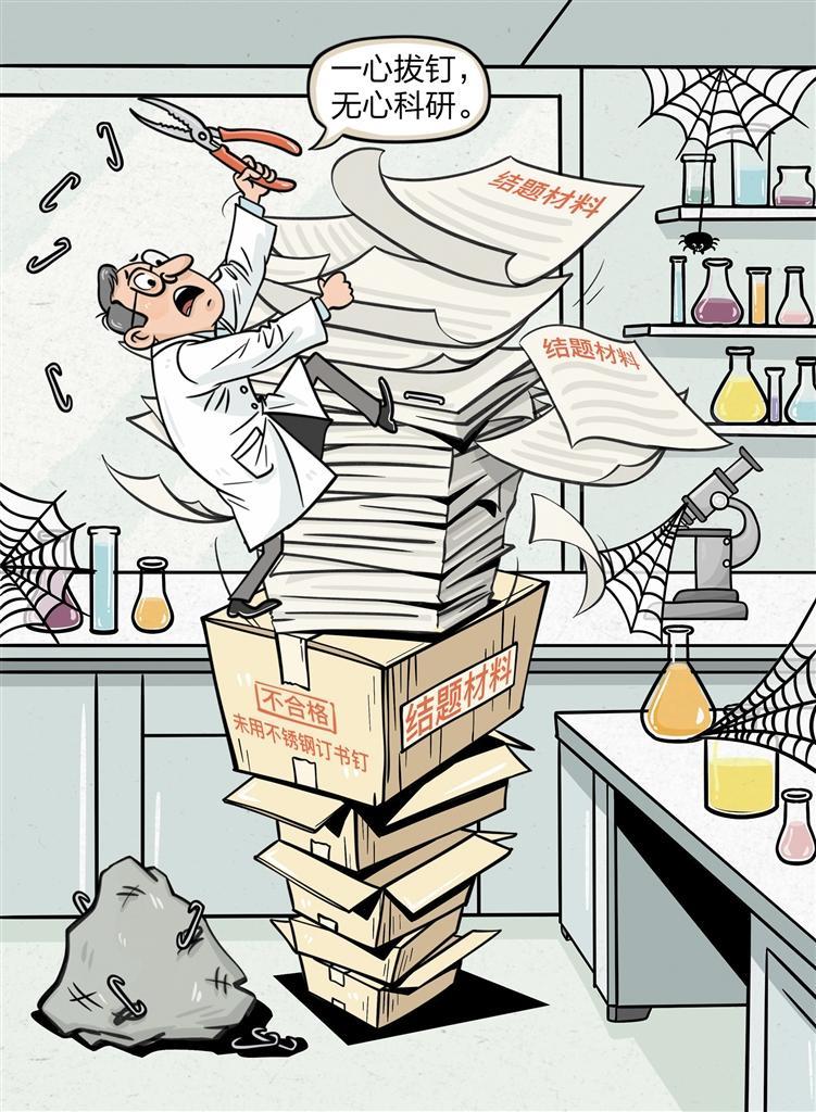 “结题的几大箱档案都弄好了,突然通知我们还不合格——订书钉没有用不锈钢的。大家只能一箱箱拆开,把订书钉一枚枚抠下来重新装订。”近日,某中央直属科研院所的研究团队负责人反映的问题引发热议。