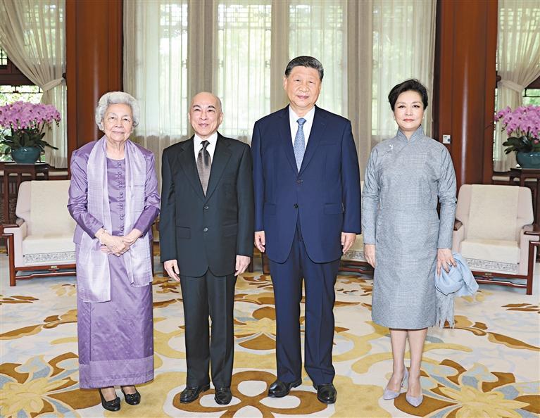 习近平热烈欢迎西哈莫尼国王和莫尼列太后再次来华,也欢迎西哈莫尼国王出席中国人民抗日战争暨世界反法西斯战争胜利80周年纪念活动。习近平表示,今年4月我对柬埔寨进行国事访问,受到国王陛下和柬埔寨人民热情友好接待,至今想起都感到十分亲切。中柬关系历经国际风云考验,结成风雨同舟的铁杆友谊,成为两国人民的宝贵财富,值得双方倍加珍惜。面对变乱交织的国际形势,中柬两国要更加坚定地站在一起,赓续传统友谊,加强团结协作,加快建设新时代全天候中柬命运共同体,为两国人民带来更多福祉。中方坚定支持柬埔寨人民走符合本国国情的发展道路,实现国家长治久安。