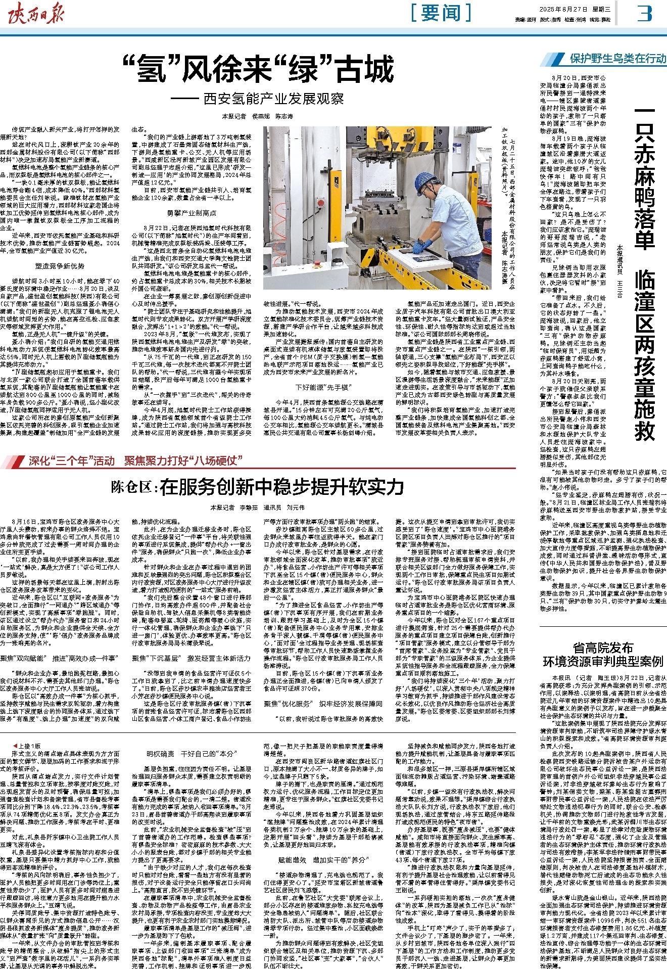 8月22日,记者在陕西旭氢时代科技有限公司(以下简称“旭氢时代”)的生产车间看到,机械臂精准完成双极板装码垛、压装等工序。