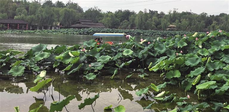 8月20日,在周至水街景区,缓缓流过的沙河水碧波荡漾。河面上,一朵朵盛开的荷花从碧绿荷叶间伸出来,迎风摇曳。河两岸的仿古建筑鳞次栉比。游客或在岸边漫步游玩,或在河中泛舟赏荷,感受着山水美景。