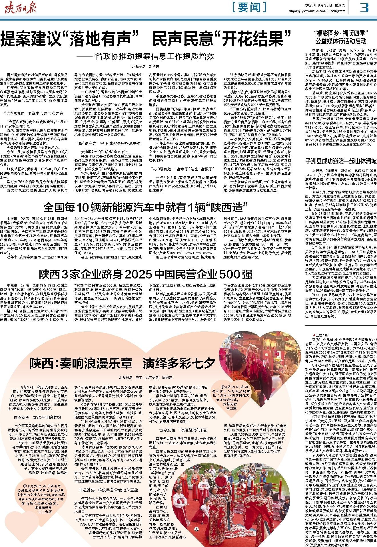 省工信厅持续开展“暖企行动”,强化重点企业跟踪服务,支持链主企业加大在陕投资力度。比亚迪2024年在陕产量107.7万辆,占比亚迪全球产量的四分之一;今年前7月产量68.9万辆,同比增长29.9%,产值增长32.8%。吉利2024年在陕产量52.1万辆;今年前7月产量29.3万辆,同比增长13%,产值增长8.9%。陕汽、法士特、汉德、质子汽车等企业加快向新能源转型,今年前7月新能源产品产量同比分别增长202.1%、128%、108%、253%。