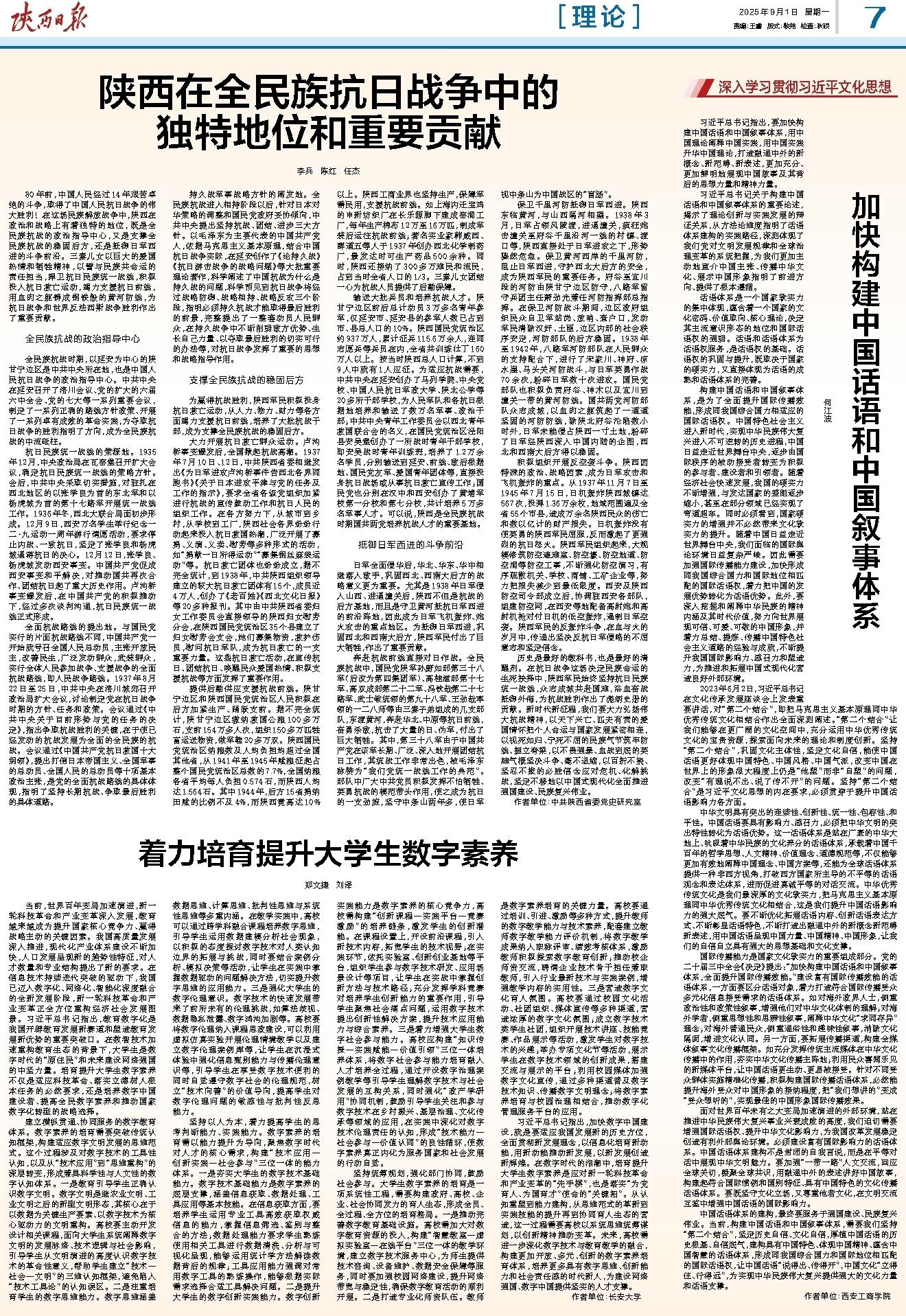 80年前,中国人民经过14年艰苦卓绝的斗争,取得了中国人民抗日战争的伟大胜利!在这场民族解放战争中,陕西在政治和战略上有着独特的地位,既是全民族抗战的政治指导中心,又是支撑全民族抗战的稳固后方,还是抵御日军西进的斗争前沿。三秦儿女以巨大的爱国热情和牺牲精神,以誓与民族共命运的责任担当,捍卫抗日民族统一战线,积极投入抗日救亡运动,竭力支援抗日前线,用血肉之躯铸成钢铁般的黄河防线,为抗日战争和世界反法西斯战争胜利作出了重要贡献。