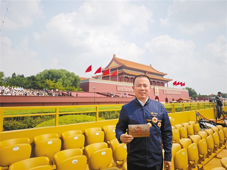 九月三日,何小虎在观礼现场留念。 受访者供图