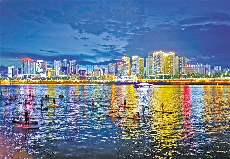 夏日傍晚,江风习习。市民游客来到汉江边,或在滨江步道上散步锻炼,或在亲水广场上戏水纳凉,或在江面上体验桨板运动的魅力,享受一江清水带来的悠闲惬意。