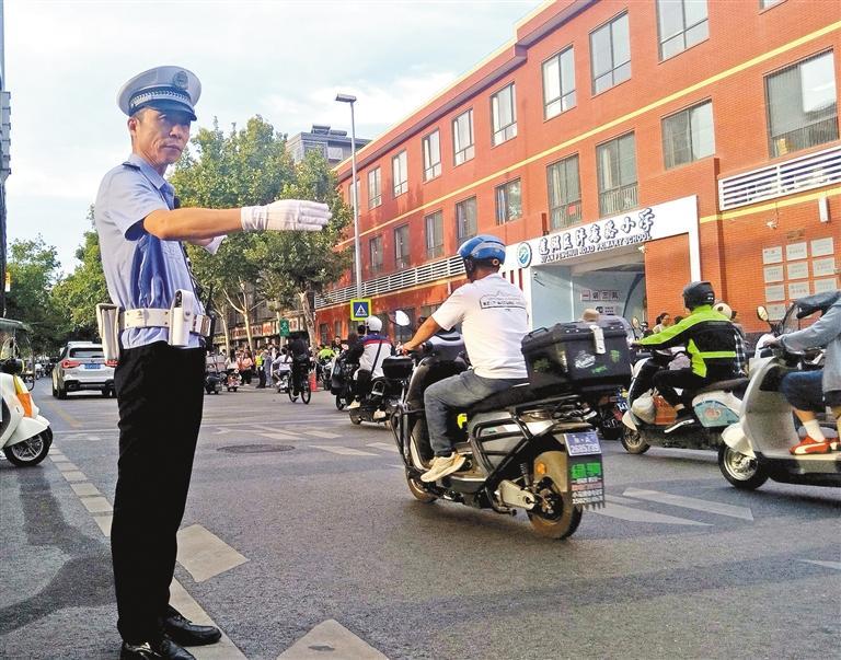 9月2日,在西安市莲湖区沣惠路小学门前,民警在指挥交通。