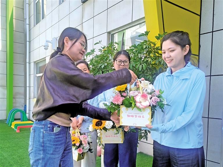 9月9日,子长市瓦窑堡街道环城南路社区举行教师节慰问活动。图为社区工作人员来到子长市第三幼儿园,将鲜花等慰问品送到教师手中。 本报通讯员 常浩浩摄