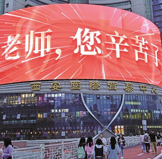 9月10日,西安市多个商厦点亮灯光向教师致敬。图为西安国际贸易中心户外电子屏上滚动显示“老师,您好!”“老师,您辛苦了!”等暖心标语。 本报记者 杜玮摄