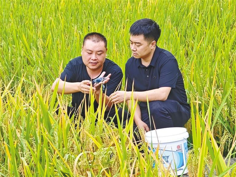九月四日,旬阳市仙河镇西沟村稻虾综合种养试验田里,孙涛(右)查看小龙虾生长情况。 受访单位供图