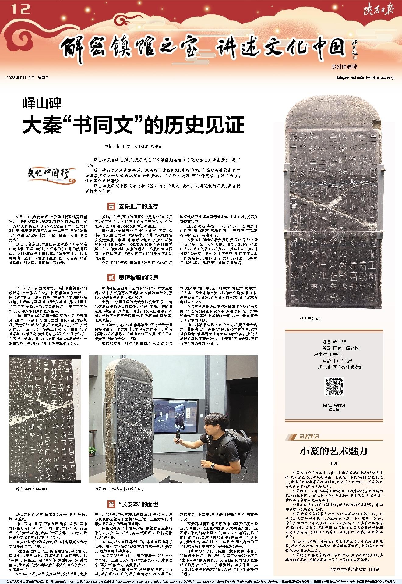 9月10日,秋雨蒙蒙,西安碑林博物馆更显凝重。一进新馆西区,游客就可以看到峄山碑。这一方碑刻的历史可从秦代追溯至宋代。公元前221年,秦王嬴政横扫六国,一匡天下,自称“始皇帝”,希望“后世以计数,二世三世至于万世,传之无穷”。