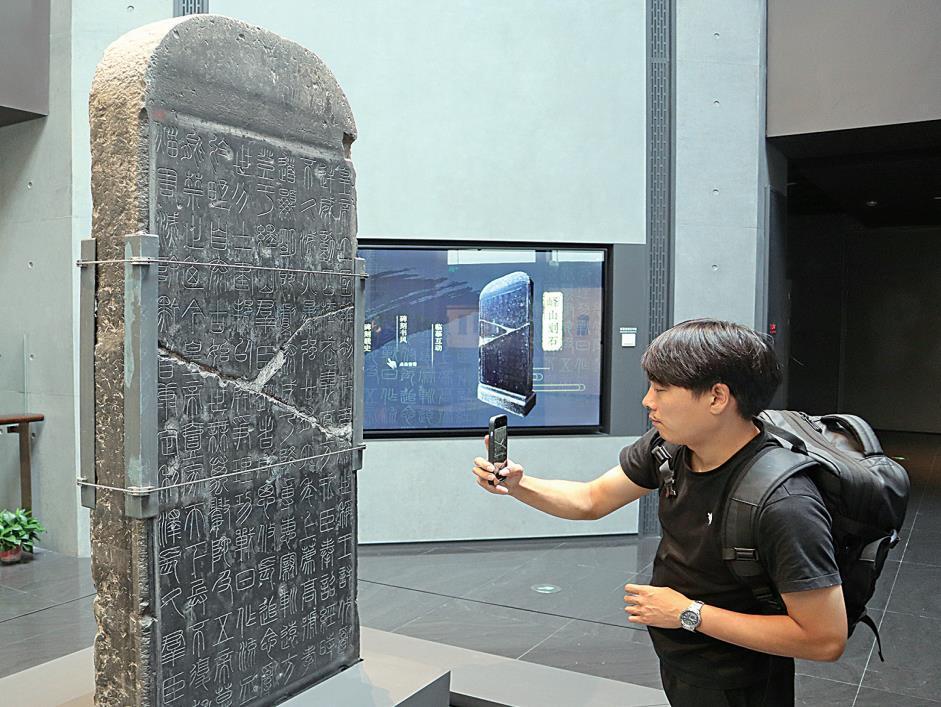 9月10日,游客在参观峄山碑。