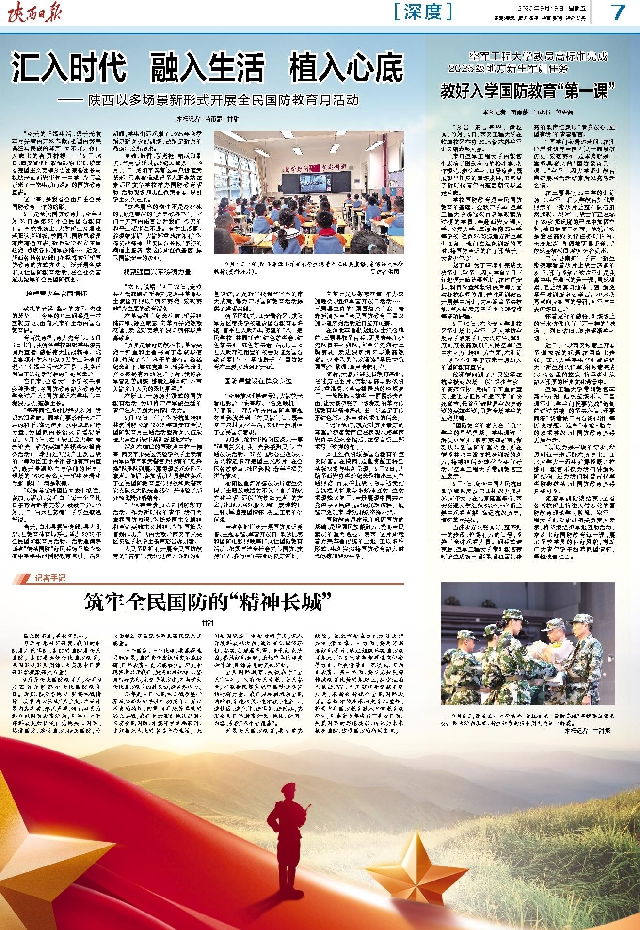 9月是全民国防教育月,今年9月20日是第25个全民国防教育日。高校操场上,大学新生身着迷彩服认真训练;校园里,国防思政课有声有色开讲;新兵欢送仪式庄重热烈,点燃各界拥军热情……近期,陕西各地各级部门积极探索创新国防教育的方式方法,广泛开展各类群众性国防教育活动,在全社会营造出浓厚的全民国防氛围。