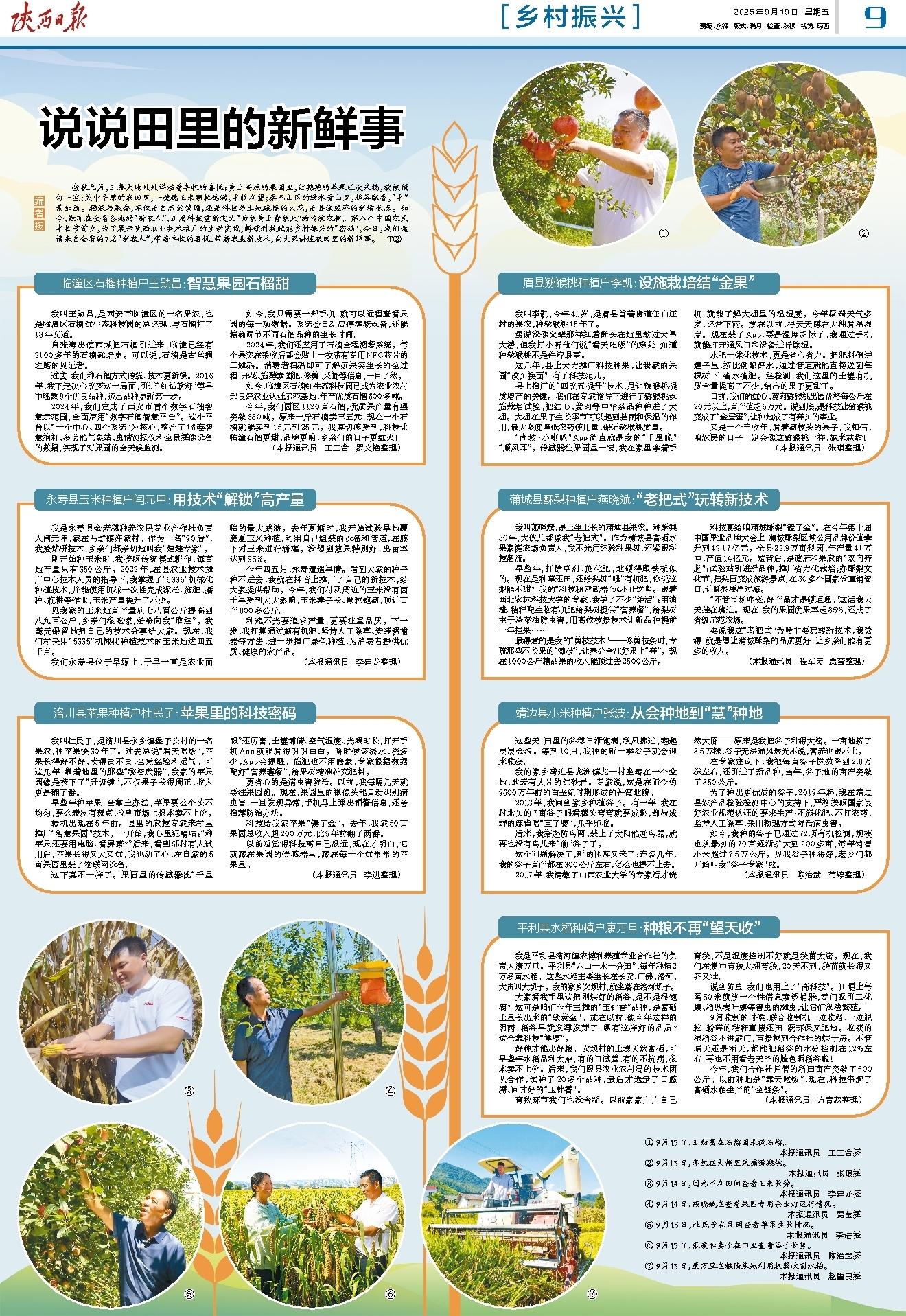 金秋九月,三秦大地处处洋溢着丰收的喜悦:黄土高原的果园里,红艳艳的苹果还没采摘,就被预订一空;关中平原的农田里,一穗穗玉米颗粒饱满,丰收在望;秦巴山区的绿水青山里,稻谷飘香,“丰”景如画。稻浪与果香,不仅是自然的馈赠,还是科技与土地碰撞的火花,是县域经济的新增长点。如今,散布在全省各地的“新农人”,正用科技重新定义“面朝黄土背朝天”的传统农耕。第八个中国农民丰收节前夕,为了展示陕西农业技术推广的生动实践,解锁科技赋能乡村振兴的“密码”,今日,我们邀请来自全省的7名“新农人”,带着丰收的喜悦、带着农业新技术,向大家讲述农田里的新鲜事。