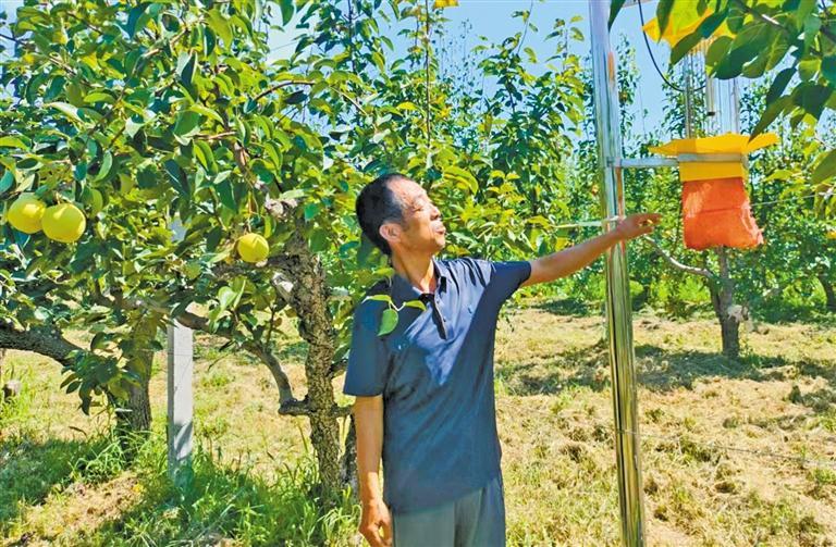9月14日,燕晓斌在查看果园专用杀虫灯运行情况。 本报通讯员 贾莹摄