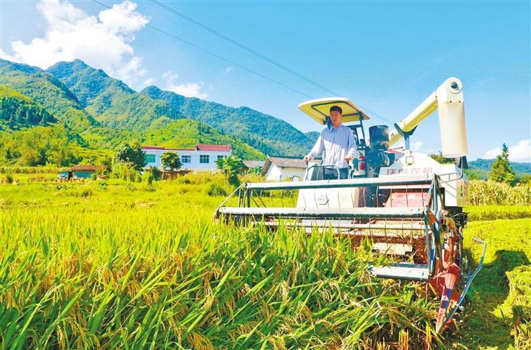 9月15日,康万旦在粮油基地利用机器收割水稻。 本报通讯员 赵重良摄