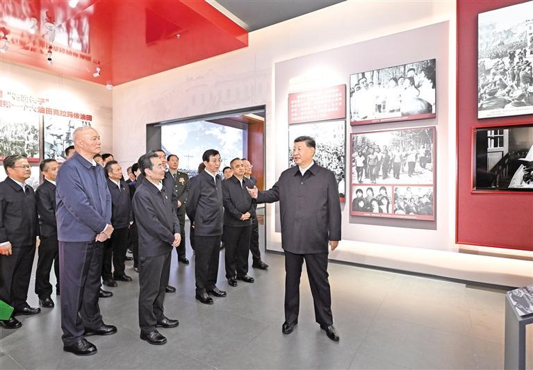 新疆维吾尔自治区成立时的历史视频,十月拖拉机厂生产的第一批拖拉机,天山百货大楼内的复原场景,打赢脱贫攻坚战的新旧对比照片,铸牢中华民族共同体意识宣传教育的展板,自治区扩大对外开放的口岸分布图……习近平认真听取讲解,不时驻足察看,详细询问有关情况。他指出,新疆70年主题成就展充满正能量,令人振奋。要精心组织观展,通过新旧对比,用鲜活的事实进一步凝聚人心、凝聚力量,激励新疆各族干部群众铸牢中华民族共同体意识,在共同富裕的道路上不断创造幸福美好生活。