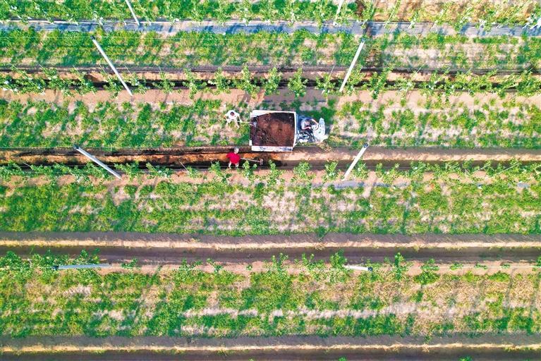 西北农林科技大学白水苹果试验站内,管理人员在给果树施肥(资料照片)。