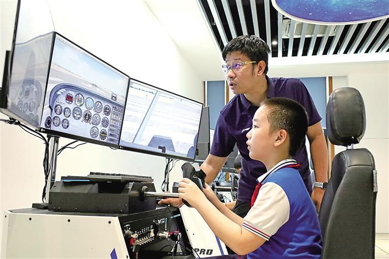 “刚开始操控时,我总是把握不好方向,经过几次练习,现在,‘飞机’已经能平稳地‘降落’在模拟机场了!”学生孙婧雯说。