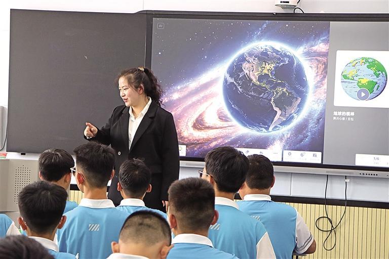 与此同时,在定边县第七中学的智能大屏上,地理老师韩嘉慧正带领学生“乘坐宇宙飞船”环游地球。