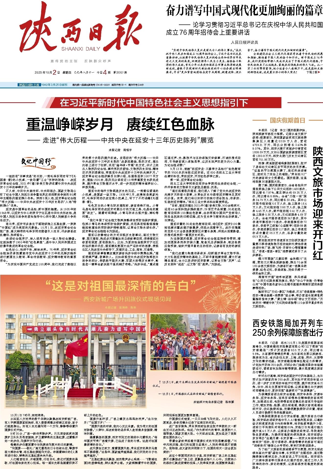 本报讯 (记者 李卫)国庆假期伊始,陕西旅游市场活力澎湃。记者从省文旅厅获悉:假期首日,陕西国家级夜间文旅消费集聚区人流量达52.59万人次,营收4759.31万元,同比分别增长2.42%和8.07%。其中,西安大唐不夜城步行街营收1608.59万元,太白山国家级旅游度假区营收1360.8万元,西安北院门历史文化街区营收701.86万元。