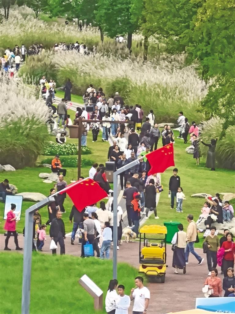 10月2日,雨后的汉中市天汉湿地公园里,挺立的芦苇随风摇曳,蓬松散开的苇穗如雪般轻盈,在阳光映照下泛起金色波浪,吸引众多市民游客前来欣赏。 本报通讯员 何祥斌摄