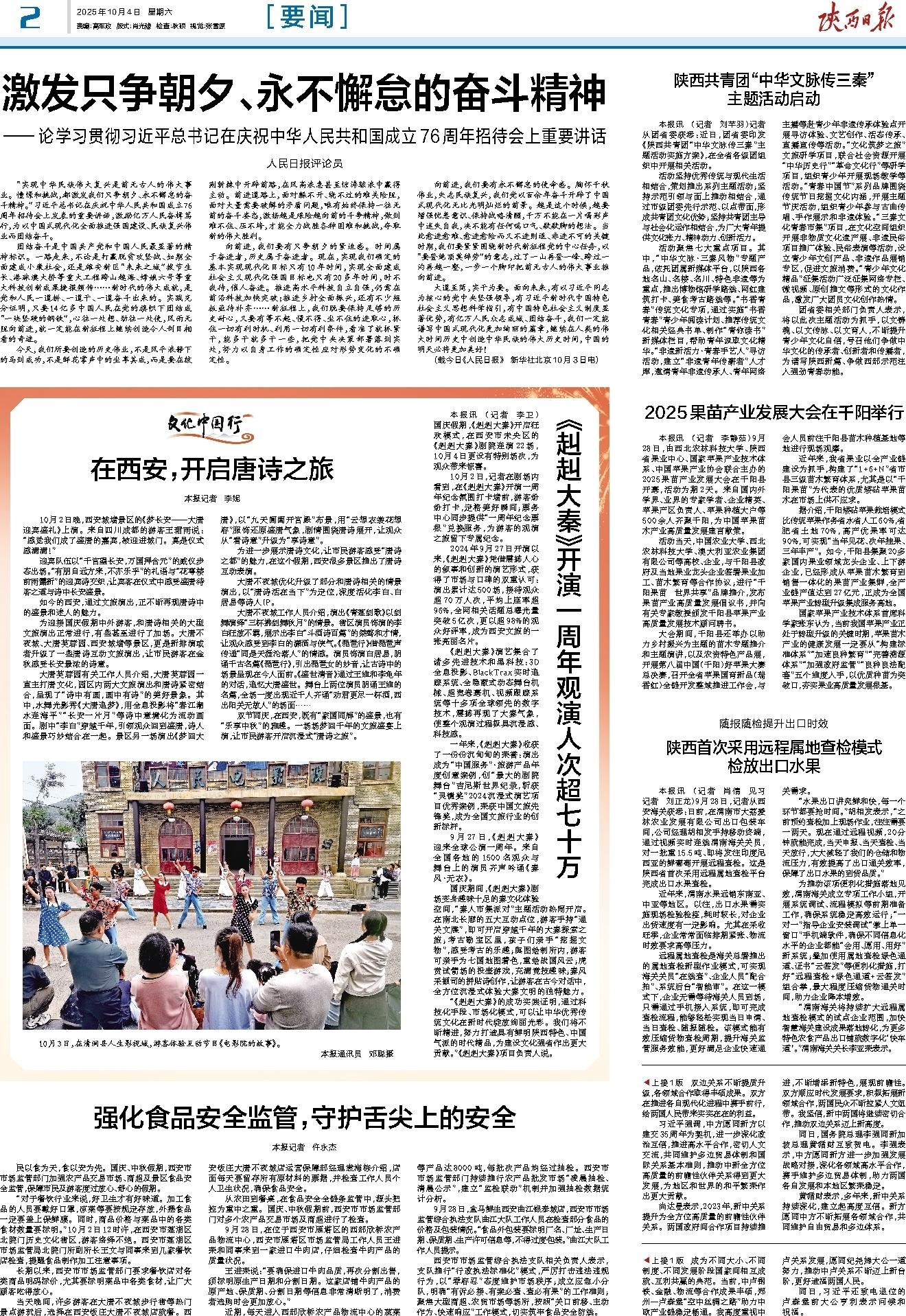 为迎接国庆假期中外游客,和唐诗相关的大型文旅演出正常进行,有些甚至进行了加场。大唐不夜城、大唐芙蓉园、西安城墙等景区,更是新排演或者升级了一些唐诗互动文旅演出,让市民游客在金秋感受长安最浓的诗意。