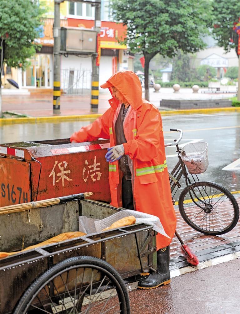 10月5日,勉县城区环卫工人在雨中作业,守护城市整洁容颜。 本报通讯员 陈林摄