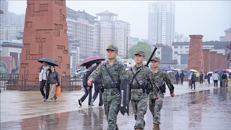 10月4日,淅淅沥沥的秋雨难挡游客来钟楼拍照打卡的热情。人群中,不时可见巡逻值守的“藏蓝身影”。