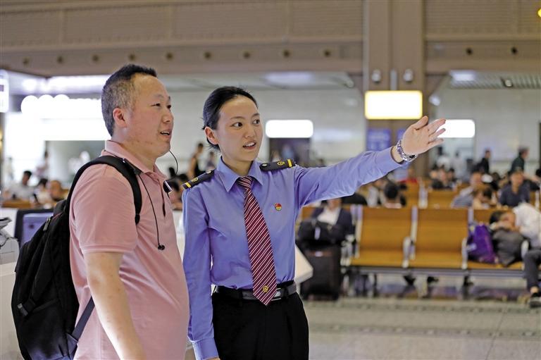 10月2日,在西安站南广场进站口,“丝路缘”亲情服务台工作人员张萌护送旅客前往重点旅客候车区。假期里,服务台前置至进站口,方便旅客咨询、办理业务。