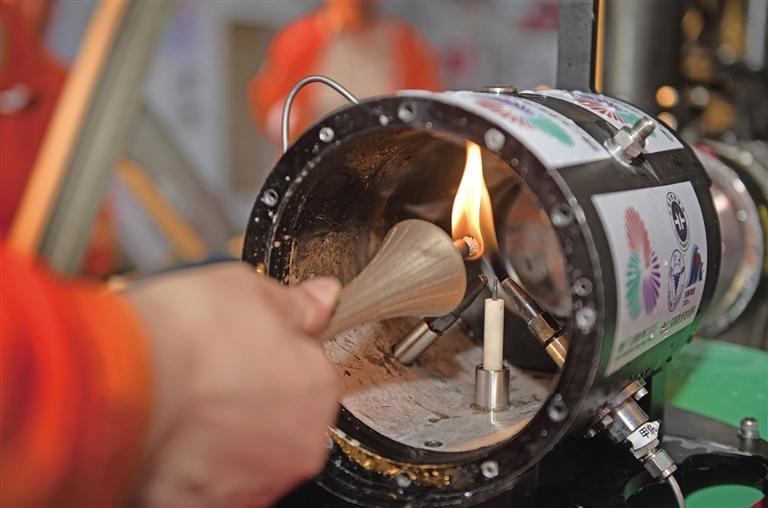 此次“源火”采集,是全球大型运动会历史上首次在深海海底获取“源火”。9月18日,广州海洋地质调查局牵头自主研发的“海马”号深海遥控潜水器(ROV)下潜至南海北部海域1522米的海底,抵达冷泉渗漏点。科研人员远程精准操控机械臂持采集舱,采集渗漏点溢出的可燃冰及伴生气。沉睡的可燃冰在降压作用下被“唤醒”,分解产生的甲烷气体成为“源火”气源。16时48分,船上的光伏发电装置将太阳能转化为电能并传输到海底,在1522米的深海成功将这股来自地球“蓝色血脉”中的气体引燃。