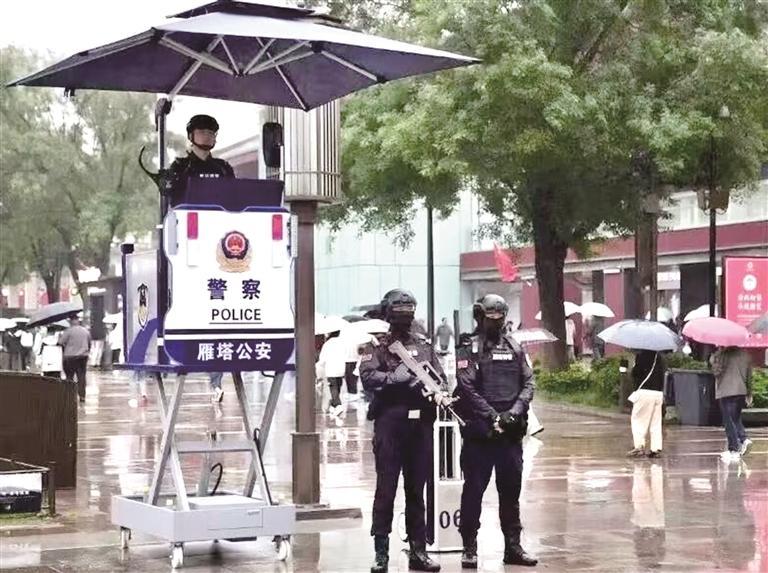 “大雁塔北广场东侧人流饱和,启动西侧通道分流!”10月1日上午,西安公安雁塔分局民警站在约4米高的警用升降执勤台上实时播报。