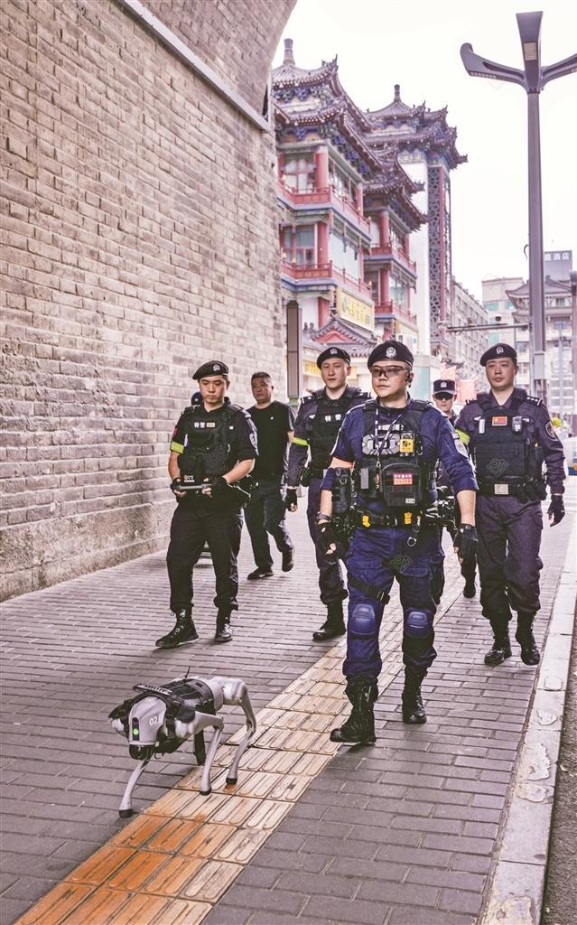 这是西安公安“科技全家桶”首次实战亮相。民警站在平台上,视野可覆盖半径50米内区域,既能观察远处人流走向,又能及时发现突发情况。“警用升降执勤台,有效解决了平峰期视野受限的问题。”雁塔分局巡特警大队王东海介绍。与此同时,西安公安雁塔分局警用机器人和机器犬组成 “巡逻搭档”,在人群中灵活穿梭。机器人配备高清摄像头和语音播报系统,既能实时采集画面,又能进行安全宣传;机器犬则可深入人群难以进入的狭窄区域进行隐患排查。