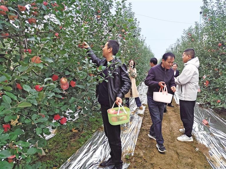 10月14日,永寿县马坊镇在马坊村举办2025年寿果大赛暨采摘推介启动仪式,苹果、广茄、红薯等特色农产品吸引了众多果商和游客。图为游客在马坊村果园采摘苹果。 本报通讯员 李建龙摄