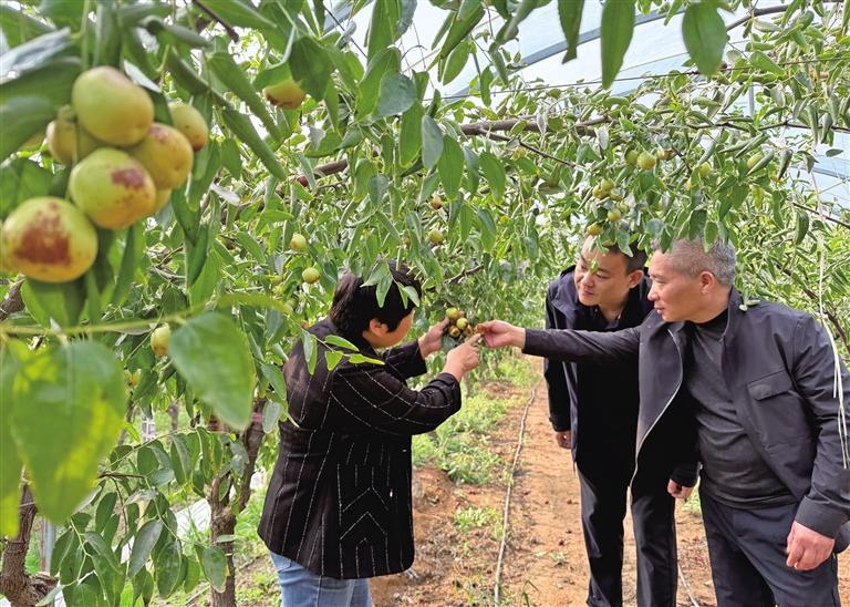 10月14日,大荔县林业局在冯村镇贺家洼村示范园举办“大荔冬枣2号”现场观摩会。西北农林科技大学的专家、主产镇的种植大户等参会。图为观摩现场。 本报通讯员 李世居摄