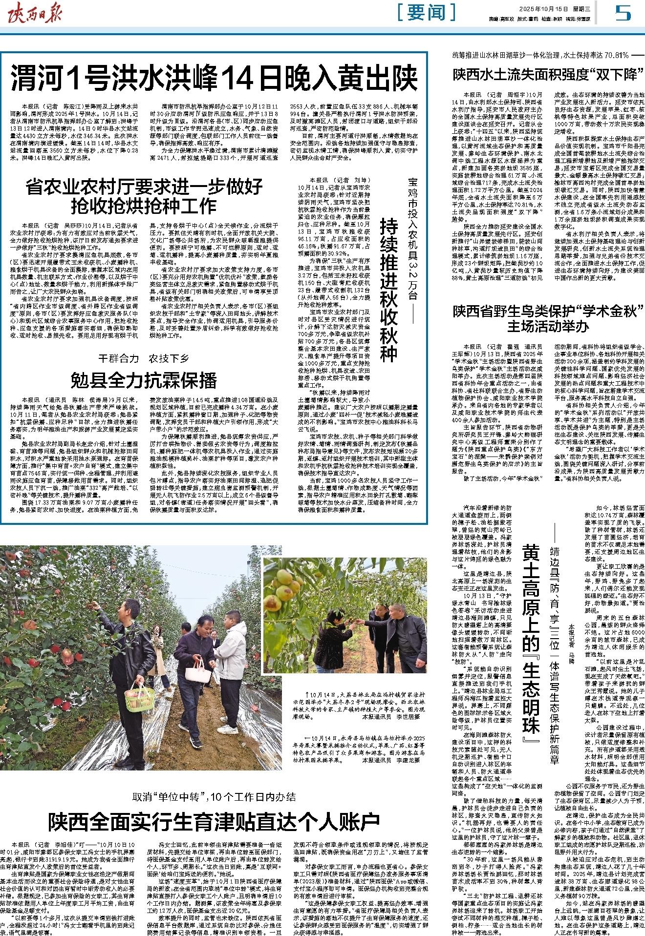本报讯 (记者 周恒宇)10月14日,由水利部水土保持司、陕西省水利厅指导,延安市人民政府主办的全国水土保持高质量发展先行区建设座谈会在延安召开。记者从会上获悉:“十四五”以来,陕西坚持统筹推进山水林田湖草沙一体化治理,以黄河流域生态保护和高质量发展、秦岭生态环境保护、南水北调中线工程水源区水源涵养为重点,新建加固各类淤地坝3585座,实施坡耕地综合治理61万亩、小流域综合治理717条,完成水土流失治理面积1.72万平方公里。截至2024年底,全省水土流失面积降至6万平方公里,水土保持率达70.81%,水土流失呈现面积强度“双下降”趋势。