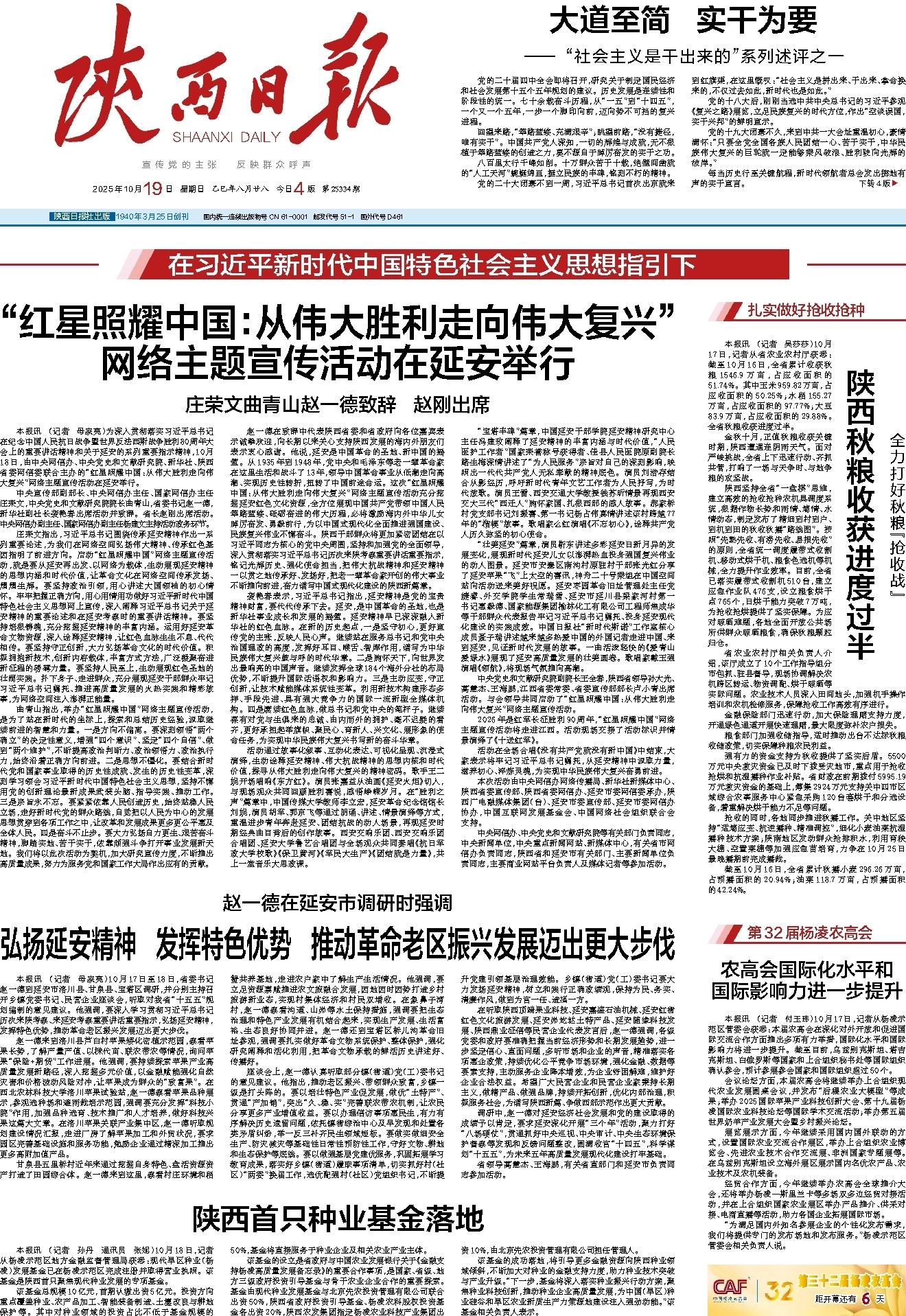 本报讯 (记者 母家亮)为深入贯彻落实习近平总书记在纪念中国人民抗日战争暨世界反法西斯战争胜利80周年大会上的重要讲话精神和关于延安的系列重要指示精神,10月18日,由中央网信办、中央党史和文献研究院、新华社、陕西省委网信委联合主办的“红星照耀中国:从伟大胜利走向伟大复兴”网络主题宣传活动在延安举行。