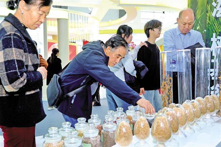 十月二十七日,在第三十二届杨凌农高会农业高新科技成果展上,观众正在查看西北农林科技大学展位的种子。 本报记者 许奥博摄