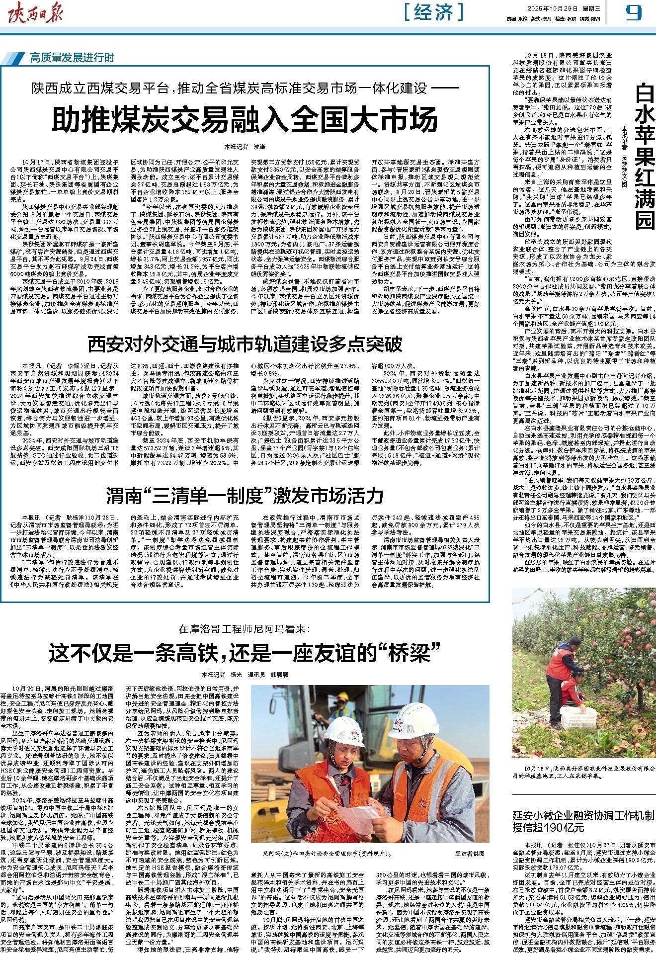 如今的白水县,不仅是重要的苹果生产基地,还是西北地区举足轻重的苹果交易集散地。据统计,该县苹果年平均出口量达15万吨。从枝头到舌尖,从田间到全球,一条集标准化生产、科技赋能、品牌运营、多元销售、融合发展的现代化苹果产业链日益成熟完善。