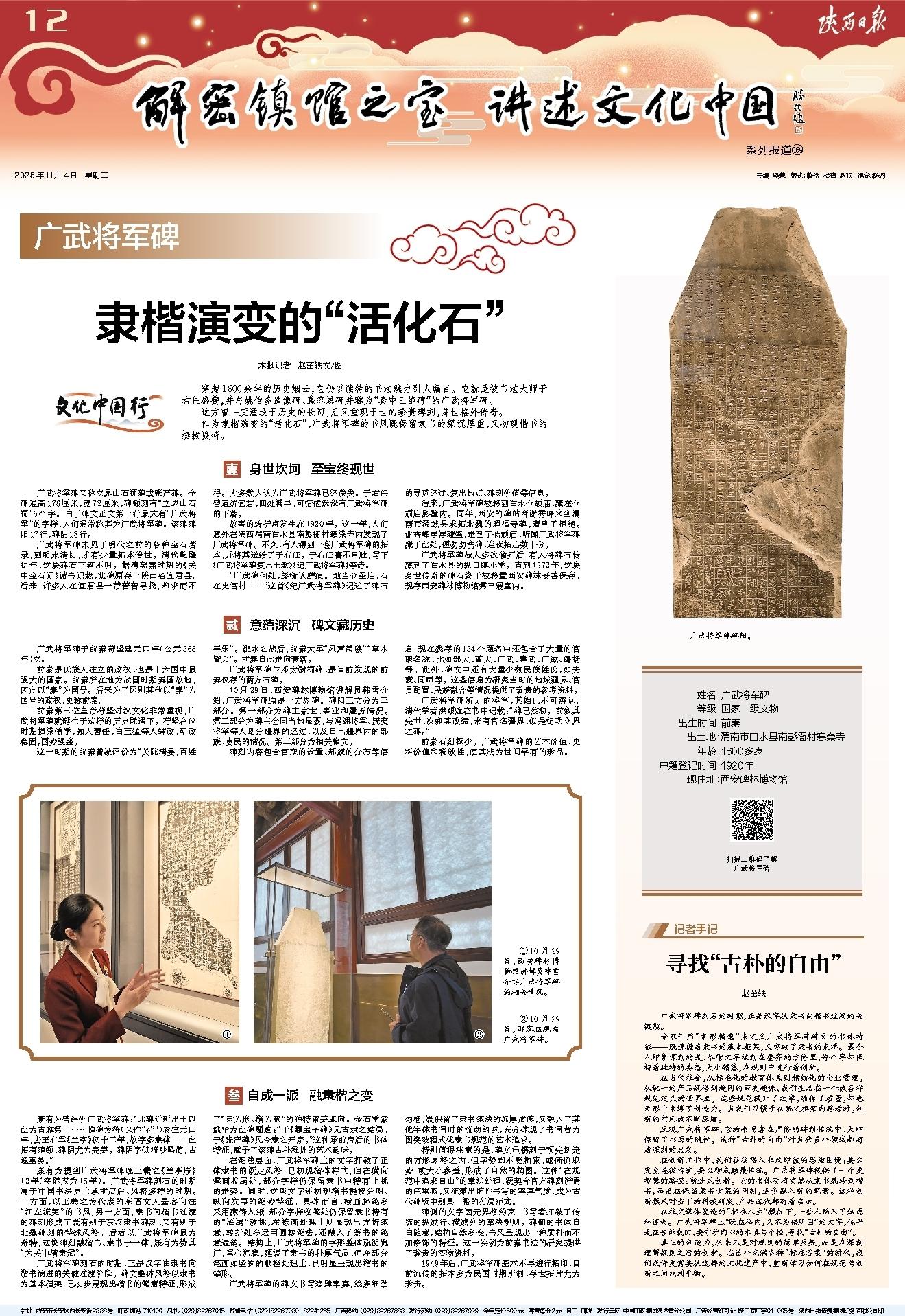 穿越1600余年的历史烟云,它仍以独特的书法魅力引人瞩目。它就是被书法大师于右任盛赞,并与姚伯多造像碑、慕容恩碑并称为“秦中三绝碑”的广武将军碑。