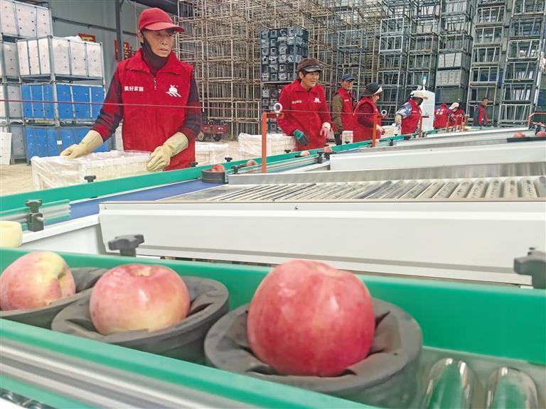 生产车间里,全自动分选线嗡嗡作响。一颗颗苹果排着队经过“光电眼”,按大小、糖度、内部瑕疵被精准分拣为不同等级。工人们熟练地打包、装箱,通过冷链将苹果发往全国各地。