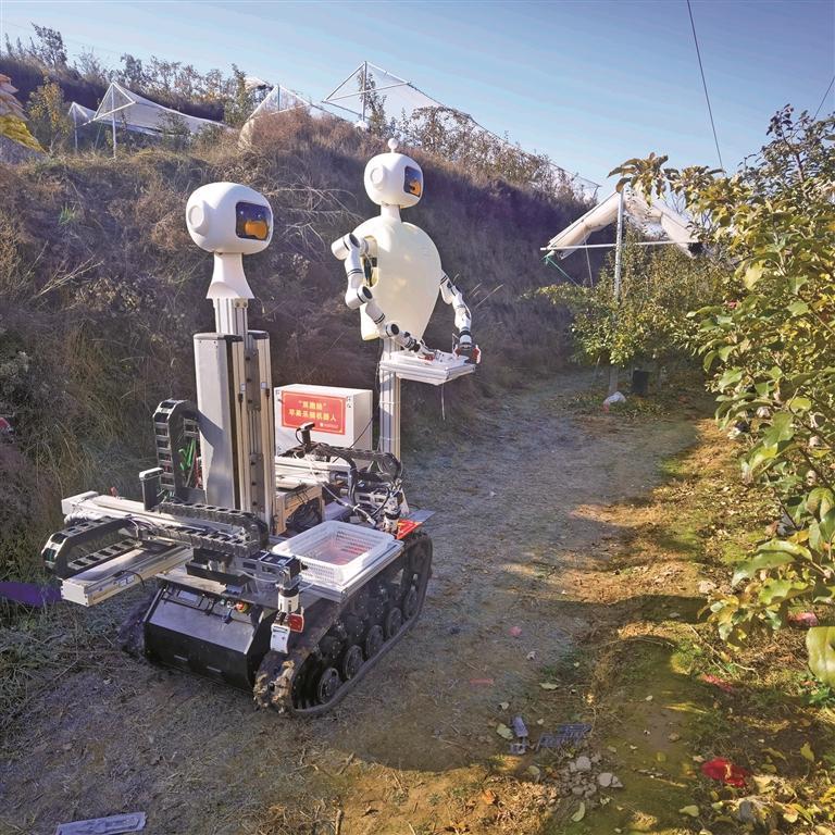 11月13日,在黄陵县隆坊镇景曦苹果试验站,由西北农林科技大学机械与电子工程学院杨福增教授团队研发的“双胞胎”苹果采摘机器人,一边“唱”着信天游,一边进行采摘作业。这台智能装备以“大娃”“小娃”协同作业的创新模式,为我国苹果产业智能化升级写下了突破性的一笔。