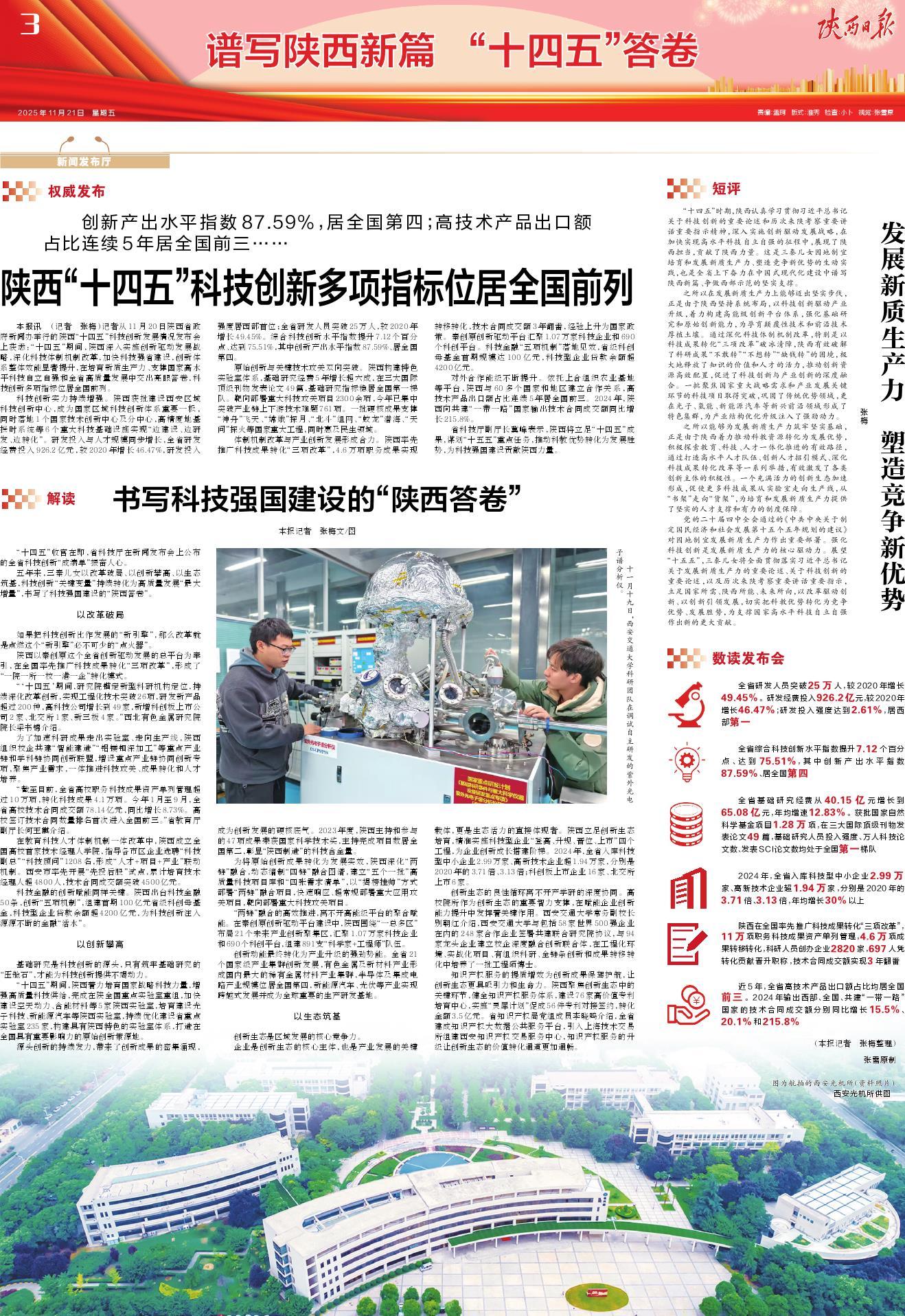 本报讯 (记者 张梅)记者从11月20日陕西省政府新闻办举行的陕西“十四五”科技创新发展情况发布会上获悉:“十四五”期间,陕西深入实施创新驱动发展战略,深化科技体制机制改革,加快科技强省建设,创新体系整体效能显著提升,在培育新质生产力、支撑国家高水平科技自立自强和全省高质量发展中交出亮眼答卷,科技创新多项指标位居全国前列。